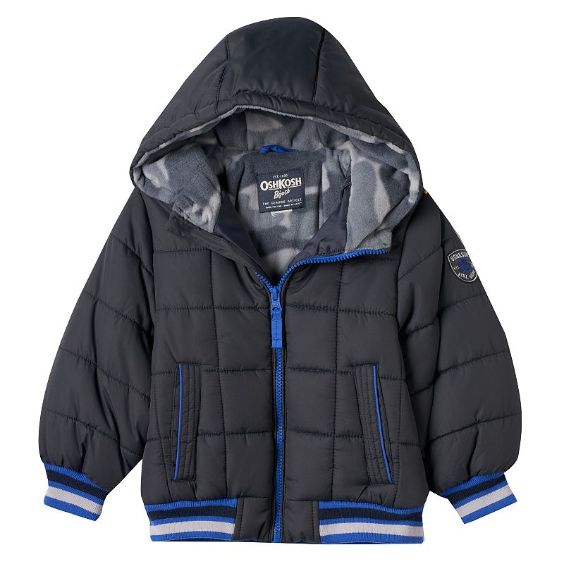 This boys' OshKosh B'gosh puffer jacket features a camouflage fleece lining in the hood that looks cool and keeps his head and ears warm